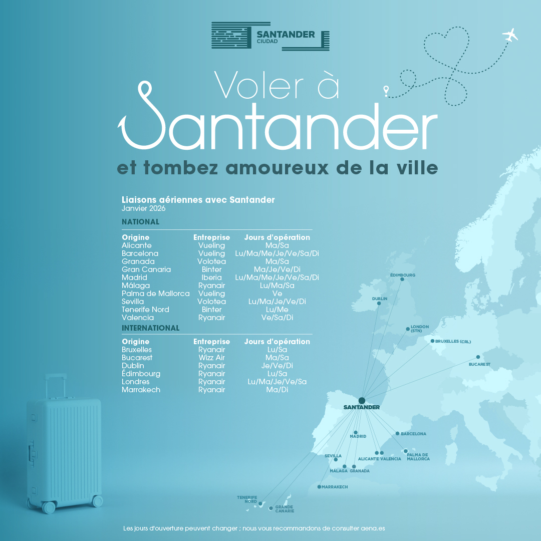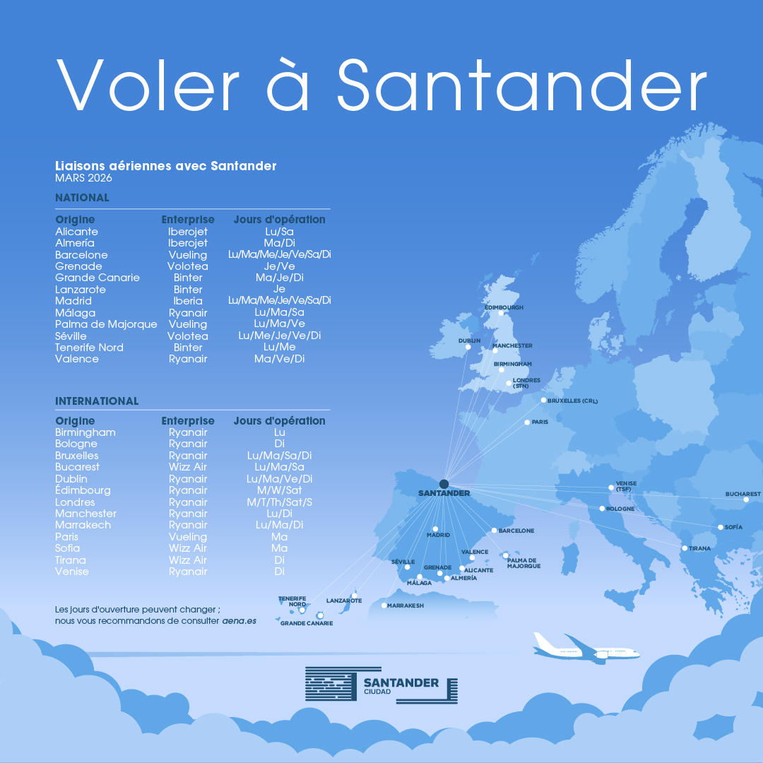 L'aéroport Seve Ballesteros-Santander est situé à seulement 5 kilomètres du centre de Santander. Il propose des vols vers les principales destinations nationales et internationales tout au long de l'année, avec une augmentation du nombre de sièges, des fréquences et des destinations pendant la saison estivale.
