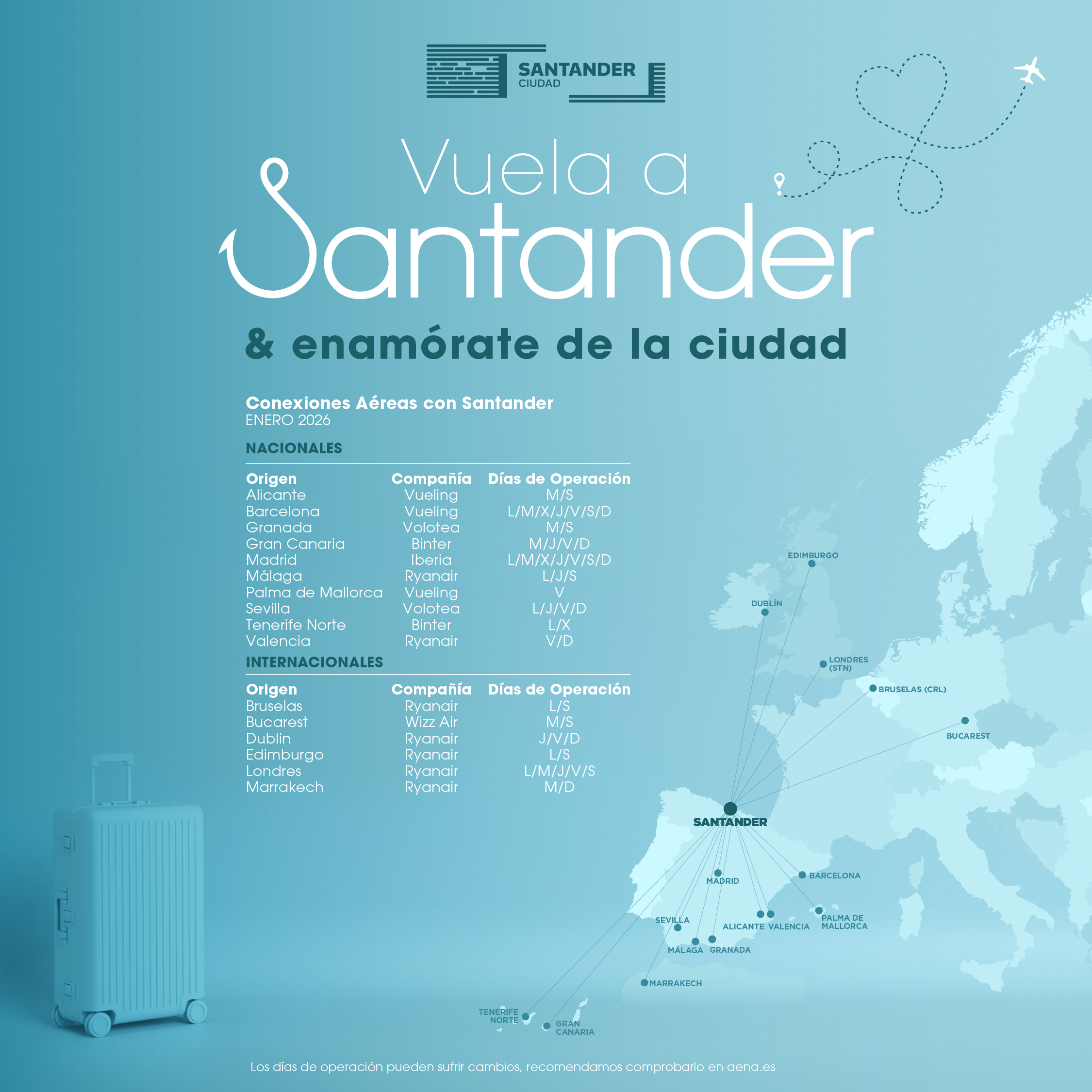 El Aeropuerto de Santander ofrece conexión directa con destinos nacionales como Barcelona, Gran Canaria, Madrid, Málaga, Sevilla, Tenerife y Valencia y, también, con destinos internacionales como Bruselas, Bucarest, Dublín, Edimburgo, Londres o Marrakech, entre otros.