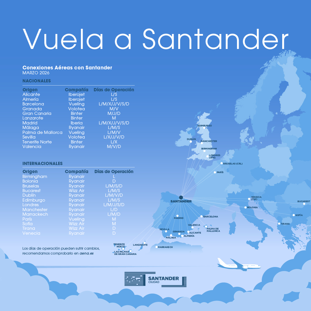 El Aeropuerto de Santander ofrece conexión directa con destinos nacionales como Alicante, Almería, Barcelona, Granada, Gran Canaria, Lanzarote, Madrid, Málaga, Palma de Mallorca, Sevilla, Tenerife y Valencia y, también, con destinos internacionales como Birmingham, Bolonia, Bruselas, Bucarest, Dublín, Edimburgo, Londres, Marrakech, París, Sofía, Tirana o Venecia, entre otros.